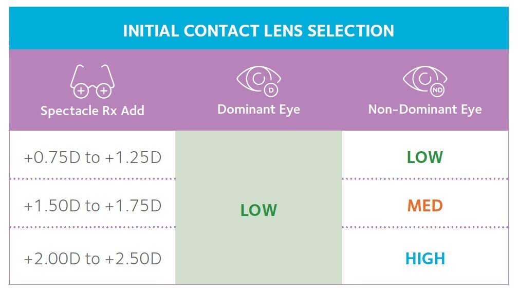 Easy-to-use fitting guide: the dominant eye always wears LOW ADD, and the non-dominant eye wears low, medium or high ADD, depending on the prescription.